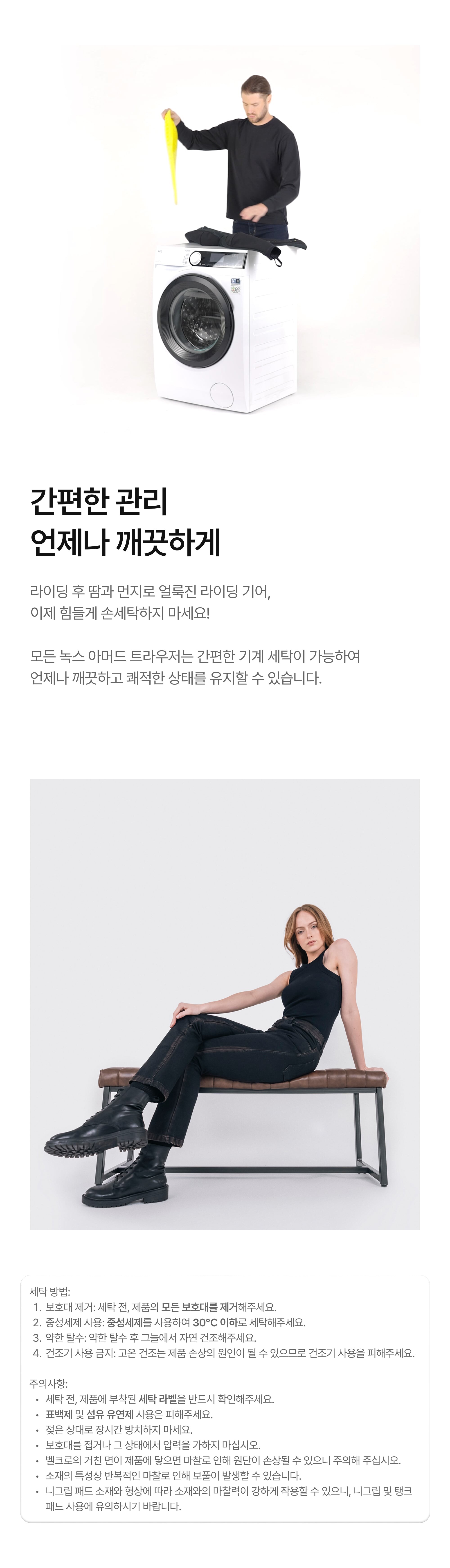 - 찬물 물세탁 권장하고 물에 오래 담그지 마십시오. 세탁 후 바로 꺼내 건조하십시오.