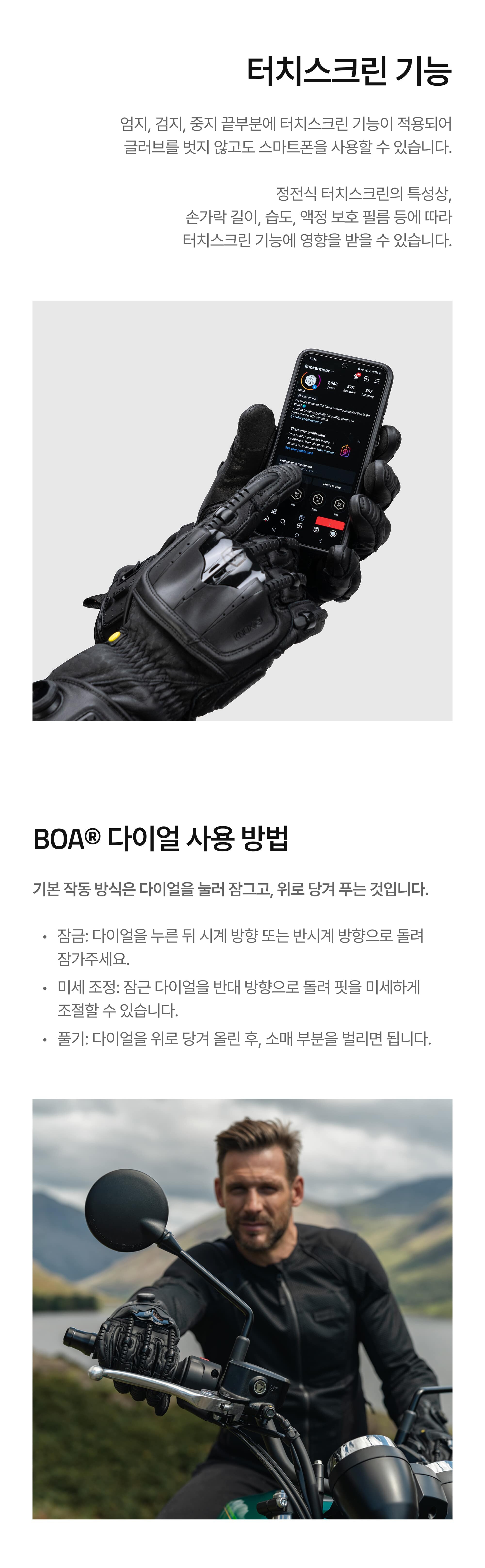 모터사이클 글러브는 사고나 추락 시 발생할 수 있는 충격과 부상 위험으로부터 손을 보호해 주는 필수 장비입니다.