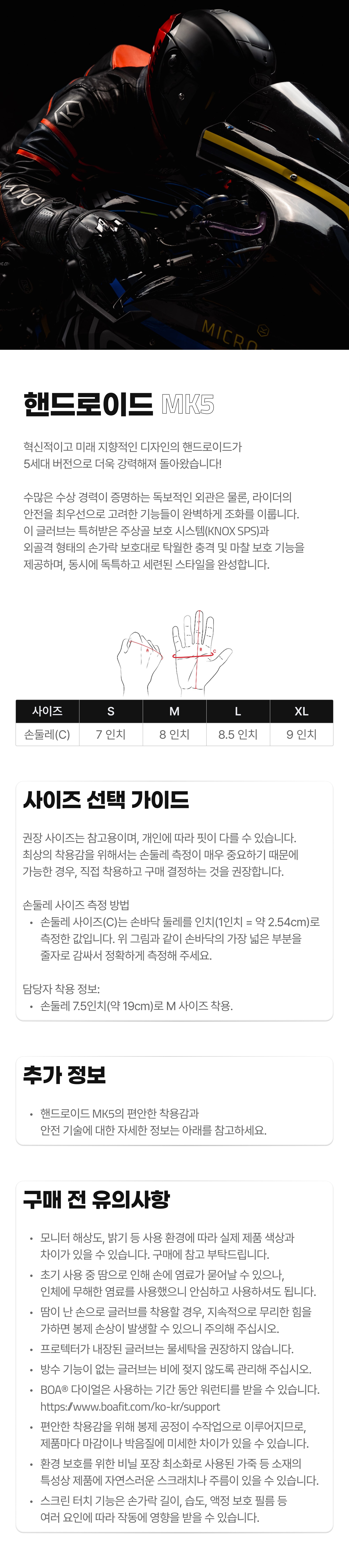 모터사이클 글러브는 사고나 추락 시 바이크, 다른 이동 수단, 도로 표면 등으로 인한 손의 충격과 부상 위험으로부터 라이더를 보호하는 장비입니다.