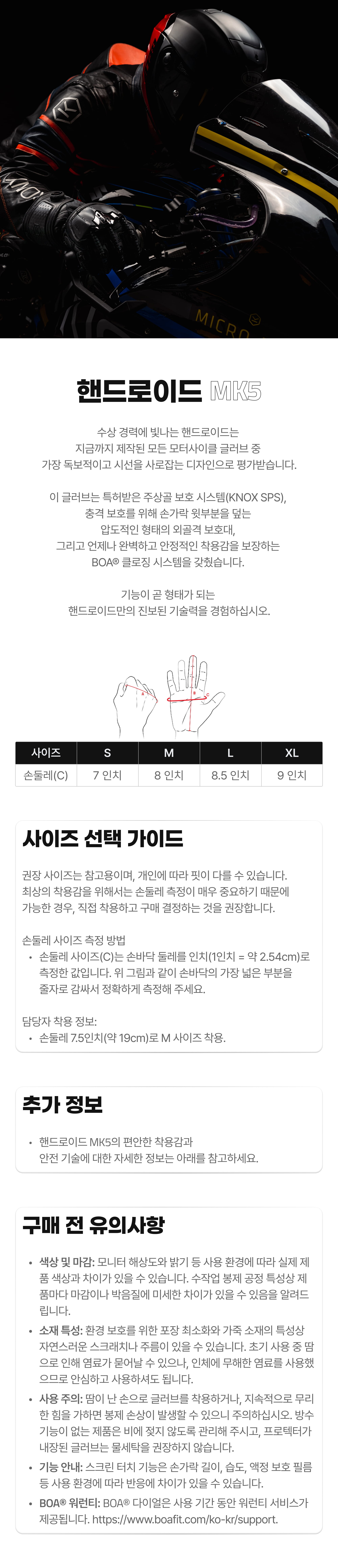 - 모터사이클 글러브는 본인 손에 잘 맞는 사이즈로 선택해야 합니다. 너무 꽉 끼거나 헐렁하다면 최적의 보호 성능과 본래의 착용감을 기대할 수 없습니다.