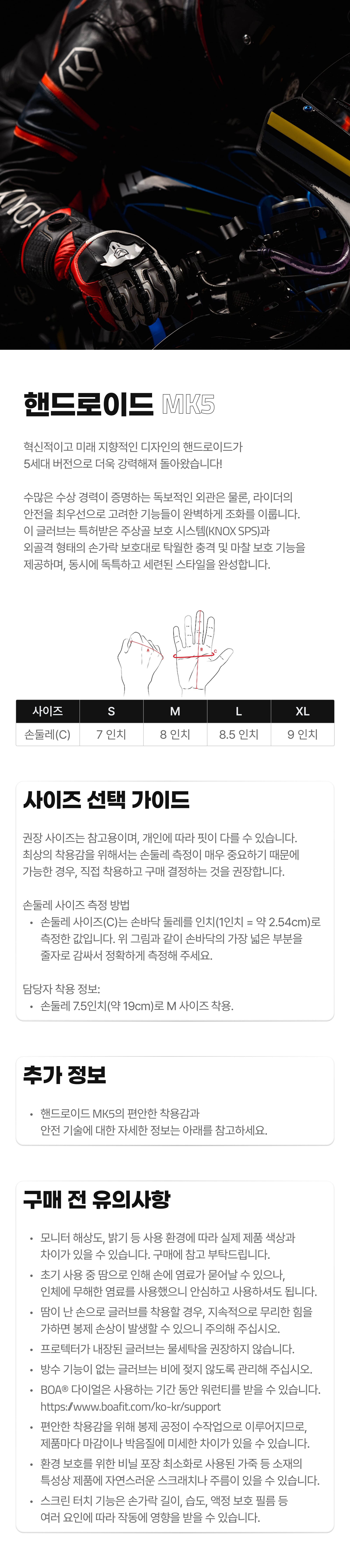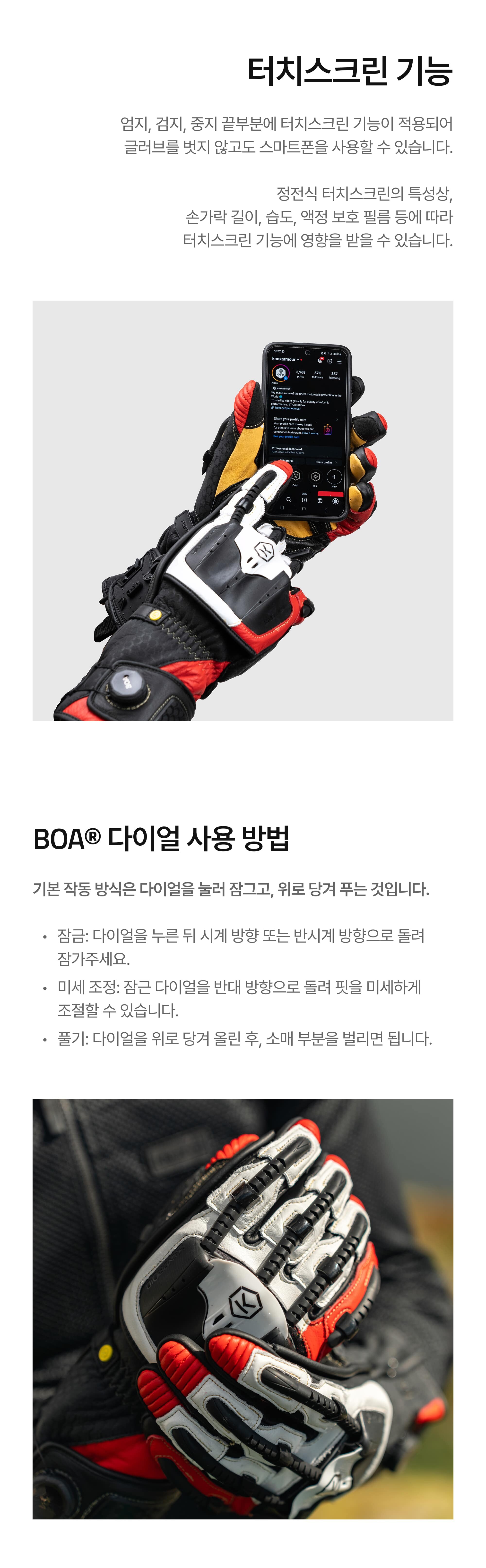모터사이클 글러브는 사고나 추락 시 발생할 수 있는 충격과 부상 위험으로부터 손을 보호해 주는 필수 장비입니다.