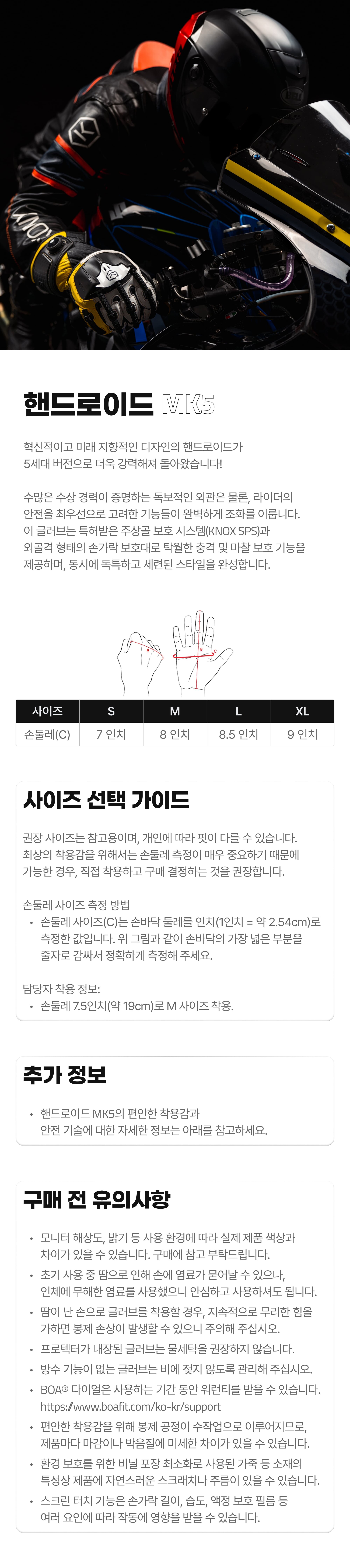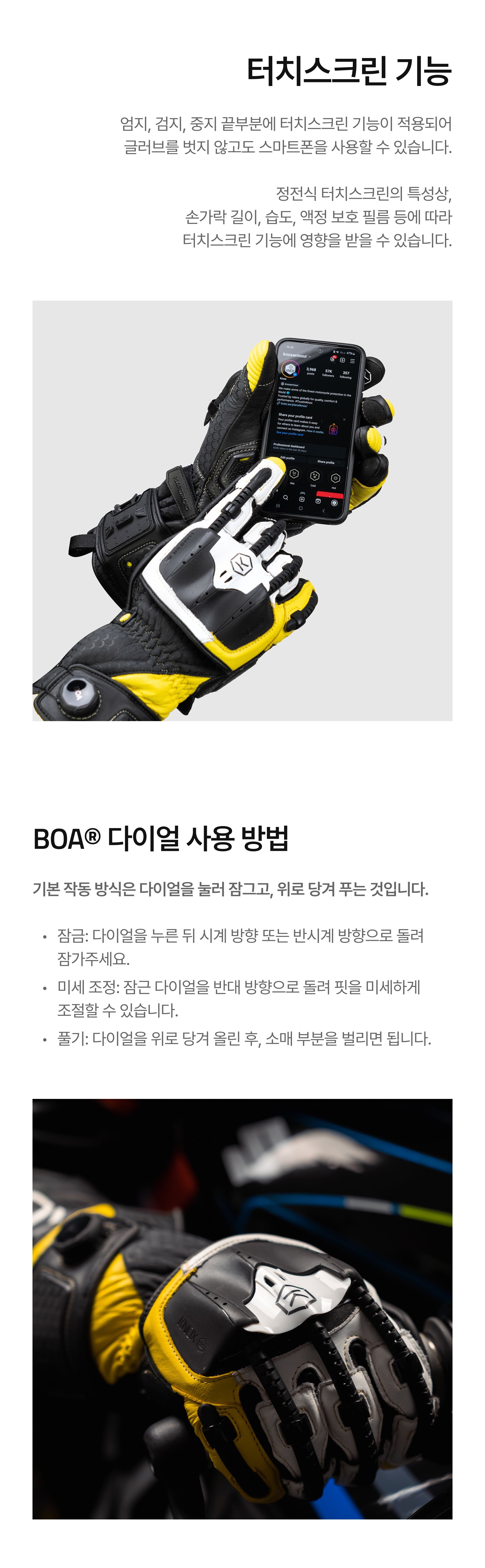 모터사이클 글러브는 사고나 추락 시 발생할 수 있는 충격과 부상 위험으로부터 손을 보호해 주는 필수 장비입니다.
