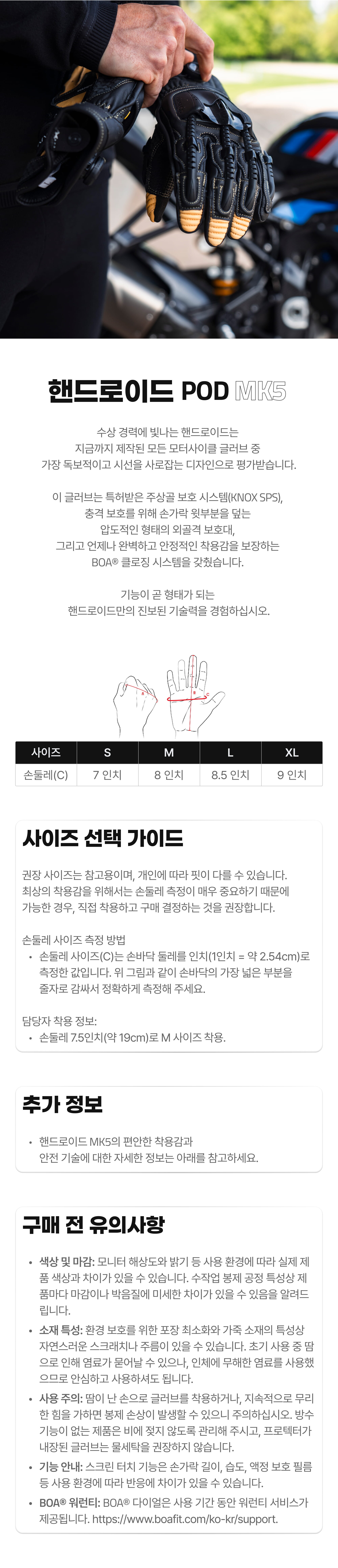 • 모터사이클 글러브는 최상의 보호 성능과 편안한 착용감을 위해 손에 잘 맞는 사이즈를 선택해야 합니다.