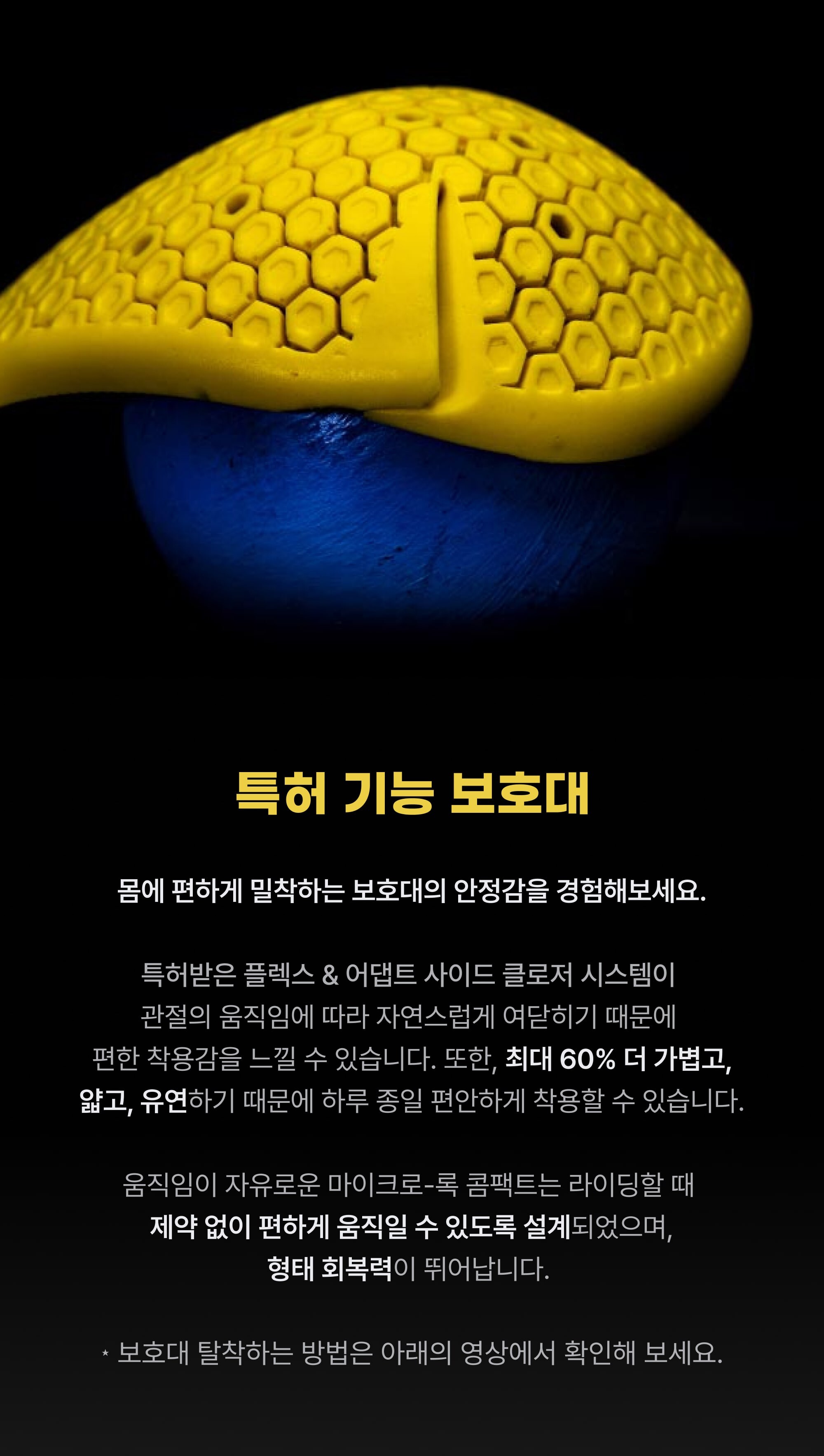 - 보호대의 밀착과 착용감이 좋지만 보호대 포켓의 홀이 좁은 편이므로 넣고 뺄 때 각별한 주의가 필요합니다.