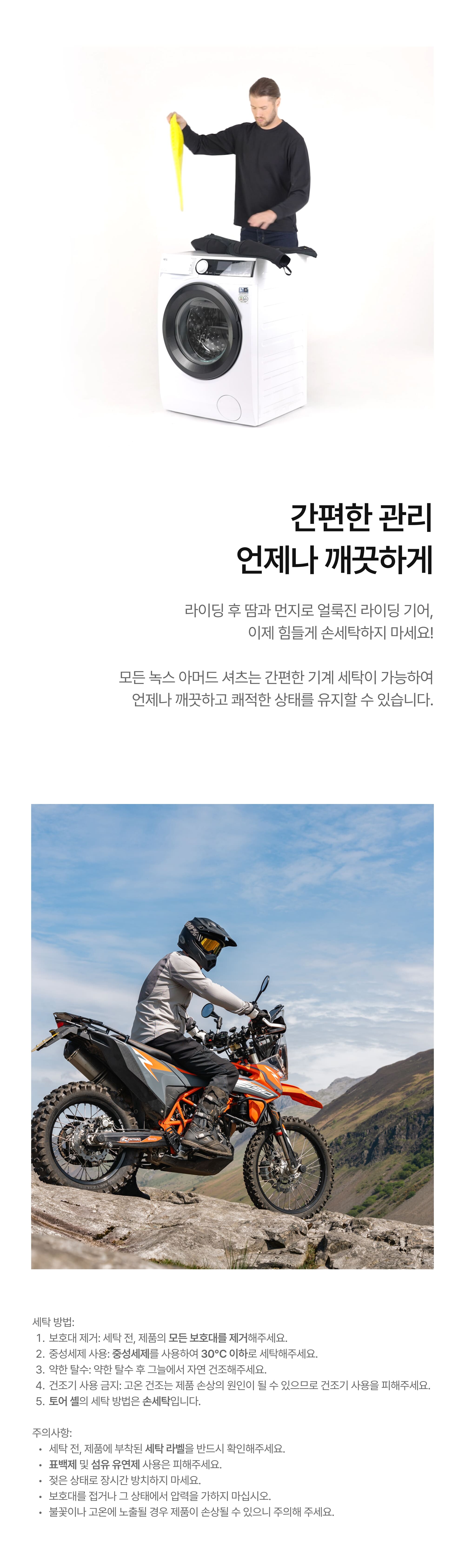 - 기능성 아웃도어 전용 세제 혹은 중성세제를 권장하고, 섬유 유연제는 권장하지 않습니다.