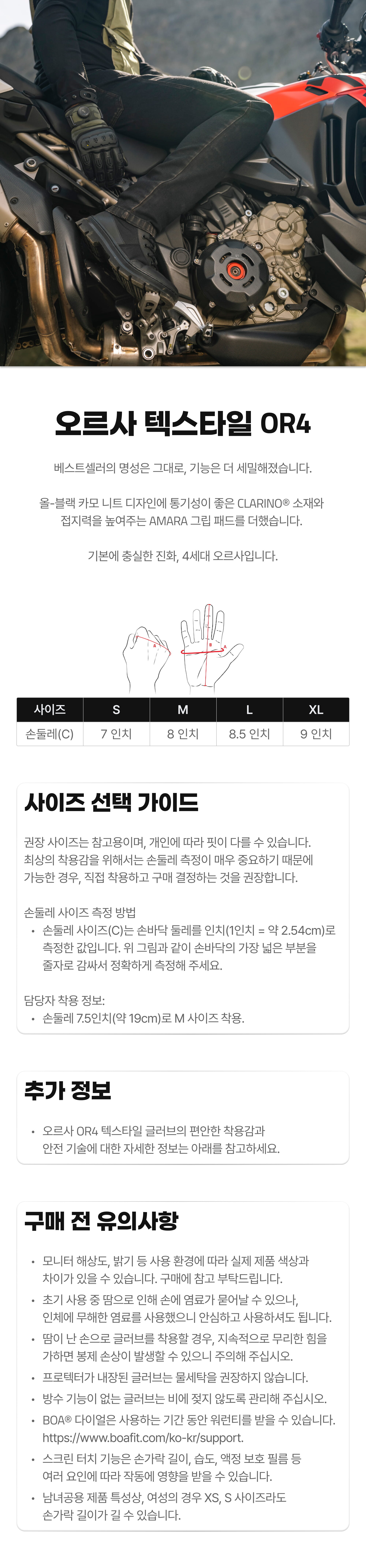 - 모터사이클 글러브는 최상의 보호 성능과 편안한 착용감을 위해 손에 잘 맞는 사이즈를 선택해야 합니다.
