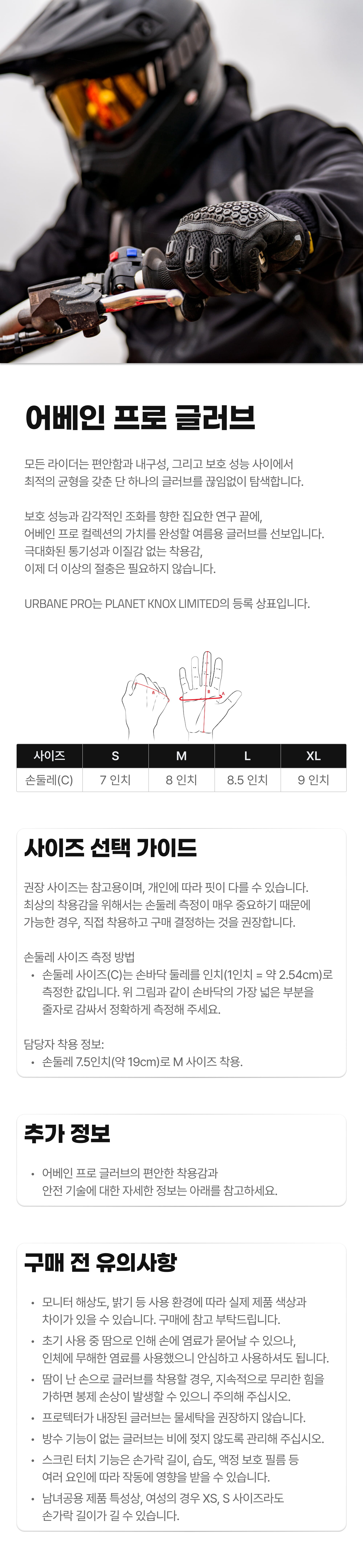 • 모터사이클 글러브는 최상의 보호 성능과 편안한 착용감을 위해 손에 잘 맞는 사이즈를 선택해야 합니다.