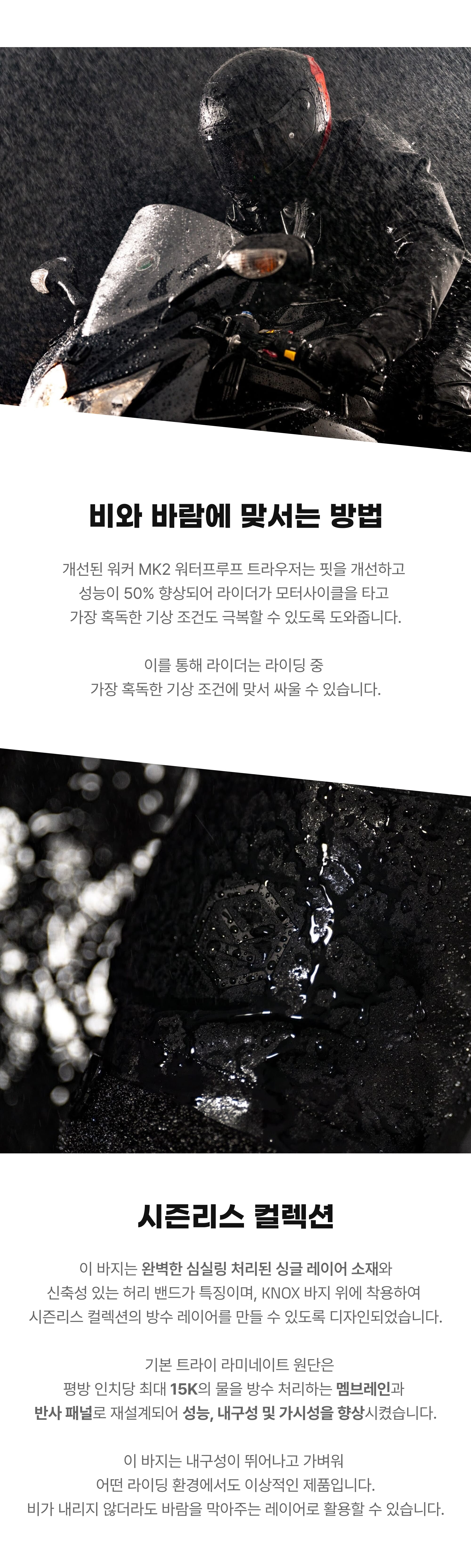 - 소비자 부주의에 의한 제품 훼손 및 세탁 잘못에 의한 변색, 변형, 품질보증 기간이 경과한 제품에 대해서는 보상의 책임을 지지 않으며 수선 가능할 때에는 실비로 처리됩니다. 또한, 상품의 보증기간 이내의 경우라도 사용 중 마모가 발생되는 소모품, 보호대 같은 주기적인 교체가 필요한 부속의 경우 구매 혹은 실비 처리 기준으로 수선이 진행됩니다.