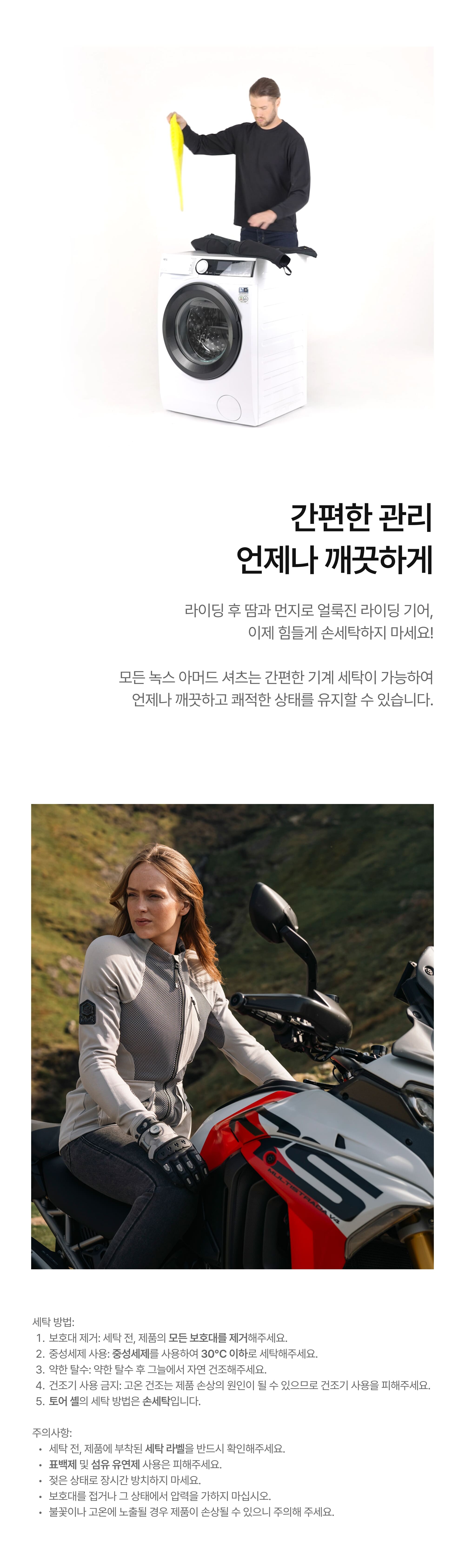 - 찬물 물세탁 권장하고 물에 오래 담그지 마십시오. 세탁 후 바로 꺼내 건조하십시오.